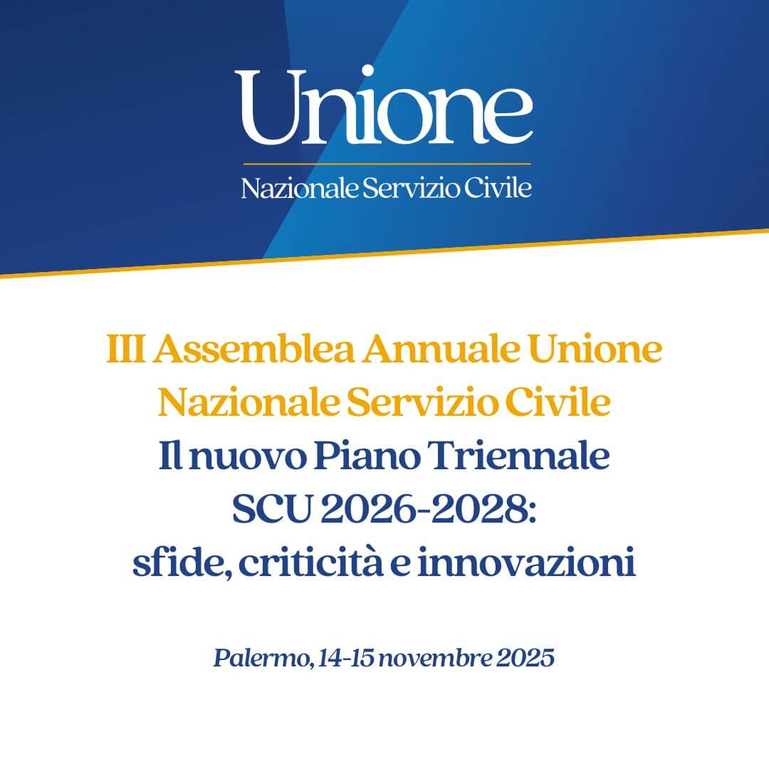 L’Unione Nazionale Servizio Civile riunisce i suoi oltre 70 Enti Titolari SCU soci per la III Assemblea Annuale , che si terrà a Palermo il 14 e 15 novembre 2025 presso l’Istituto Gonzaga. Il tema centrale sarà “Il nuovo Piano Triennale SCU 2026-2028: sfide, criticità e innovazioni”.
